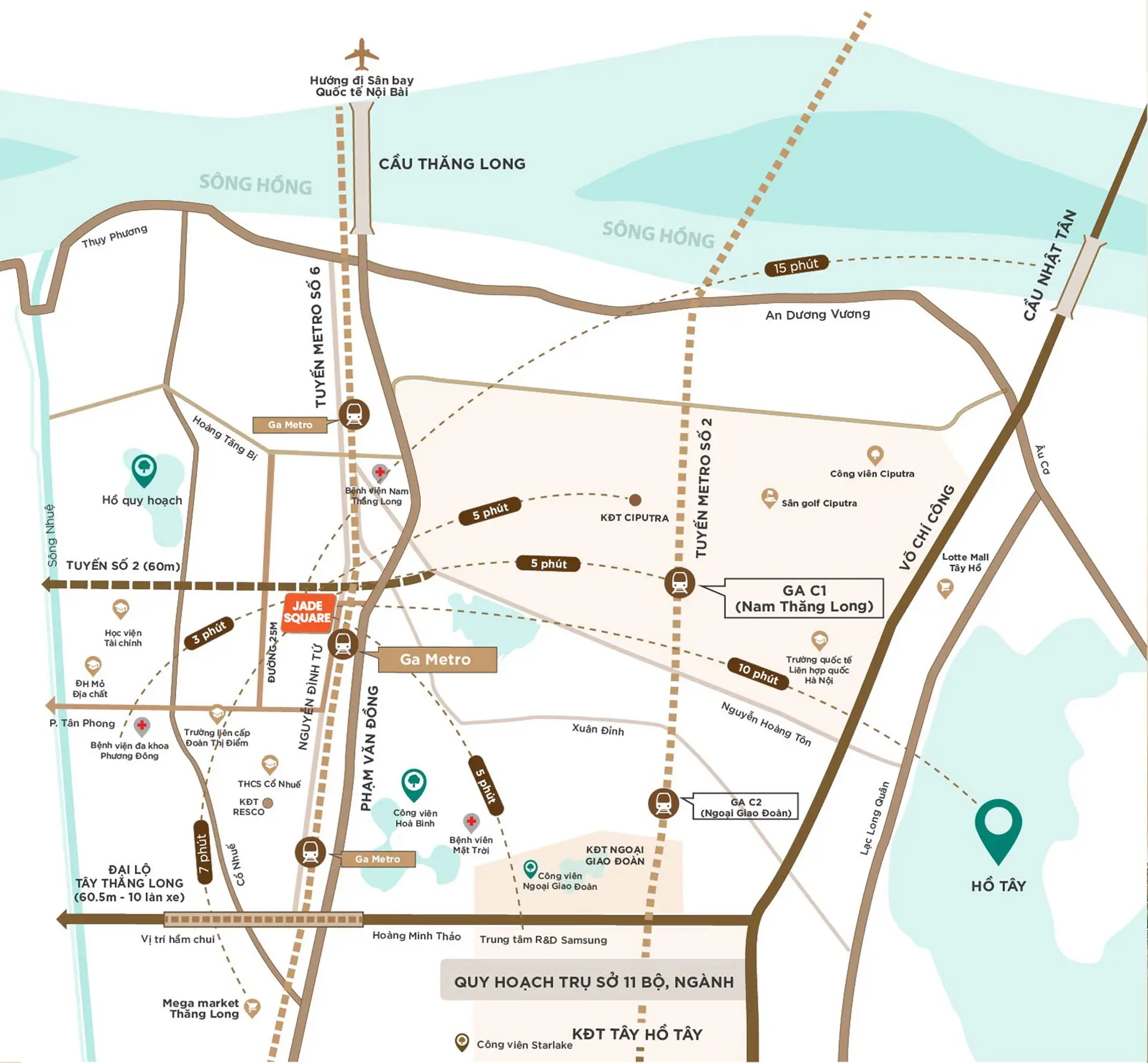 • 5 phút: Kết nối đến “New CBD” Tây Hồ Tây – nơi quy tụ 13 Bộ/ngành, trụ sở Samsung, và các tòa văn phòng hạng A.